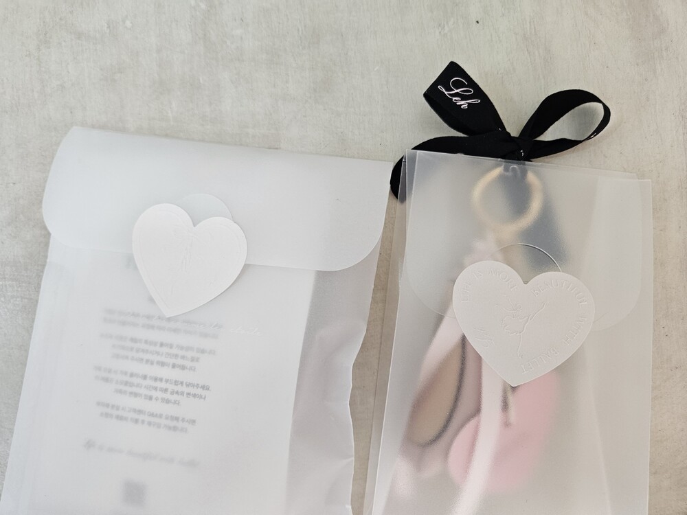 더블 하트텍이 달린 제품이 반투명 pp박스에 담겨 있습니다