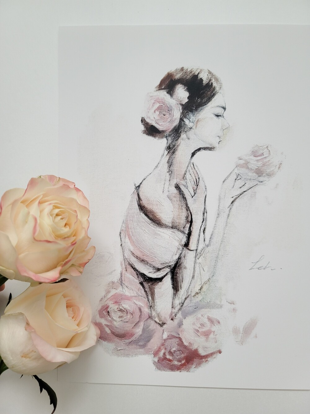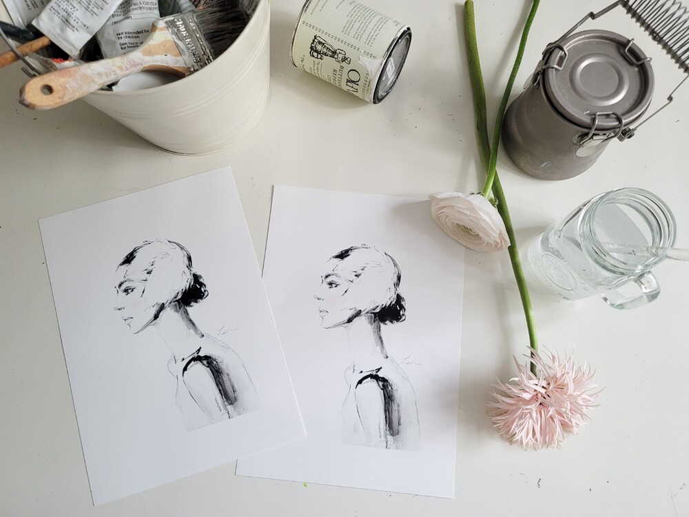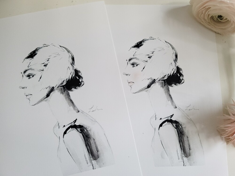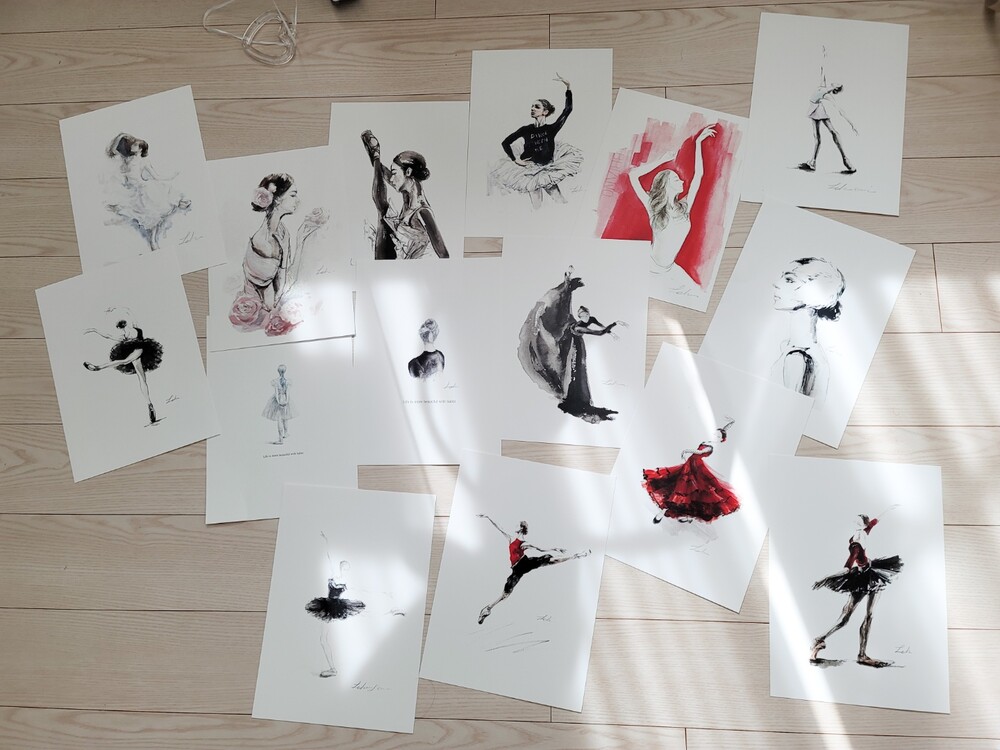 볼과 입술의 페일 핑크색이 인쇄작품엔 거의 표현되지않아 직접 인쇄그림위에 한장한장